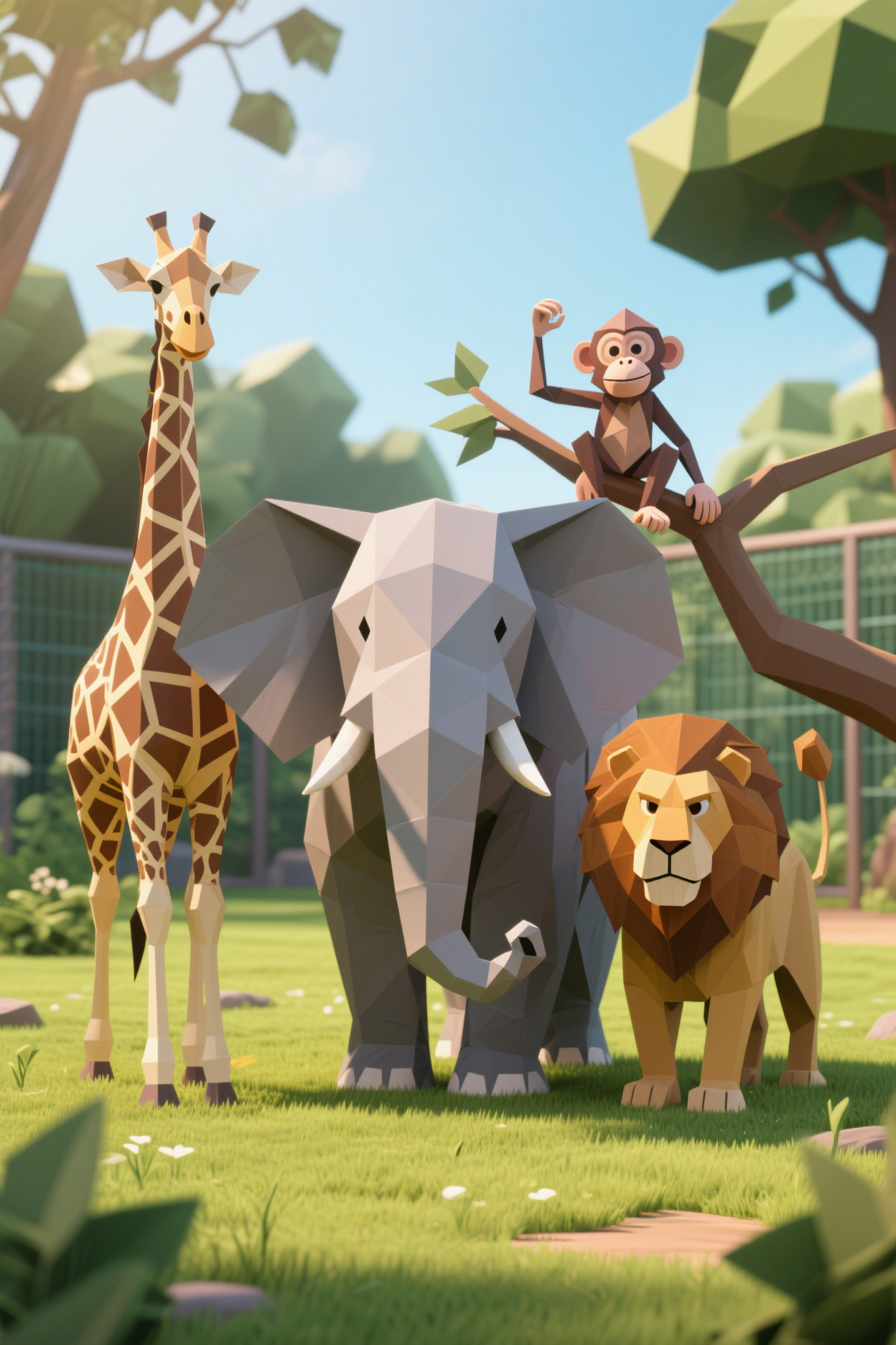 图片风格为「3D渲染」折纸,动物园的动物合照,,低多边形建模,比例「2:3」