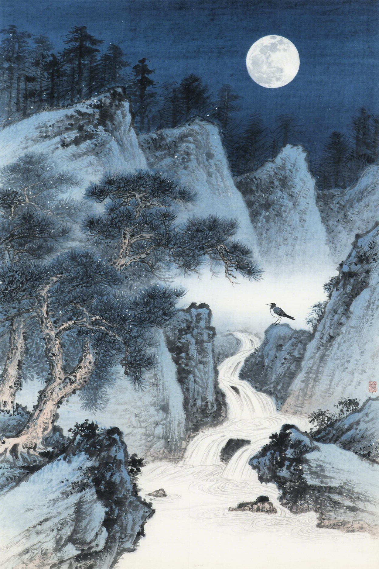 月夜下的静谧山林,银色月光洒在青松与山石之上,泉水潺潺,夜鸟低鸣,浓淡墨分五色技法,宋代夜景绘画风格,深靛蓝与银白色冷暖对比,比例 「2:3」