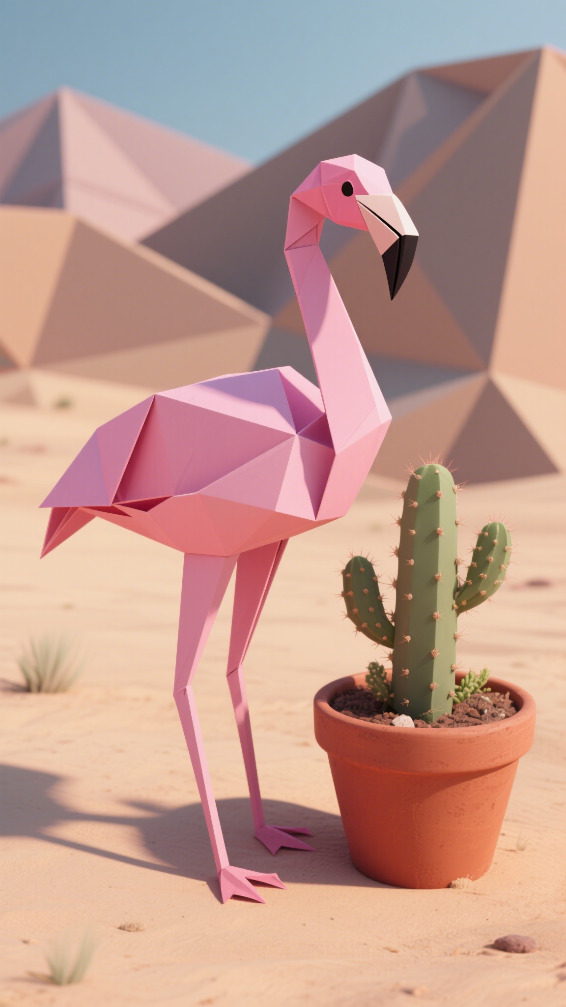 一只粉色折纸火烈鸟站在仙人掌花盆旁,背后是几何折纸风格的沙漠背景。