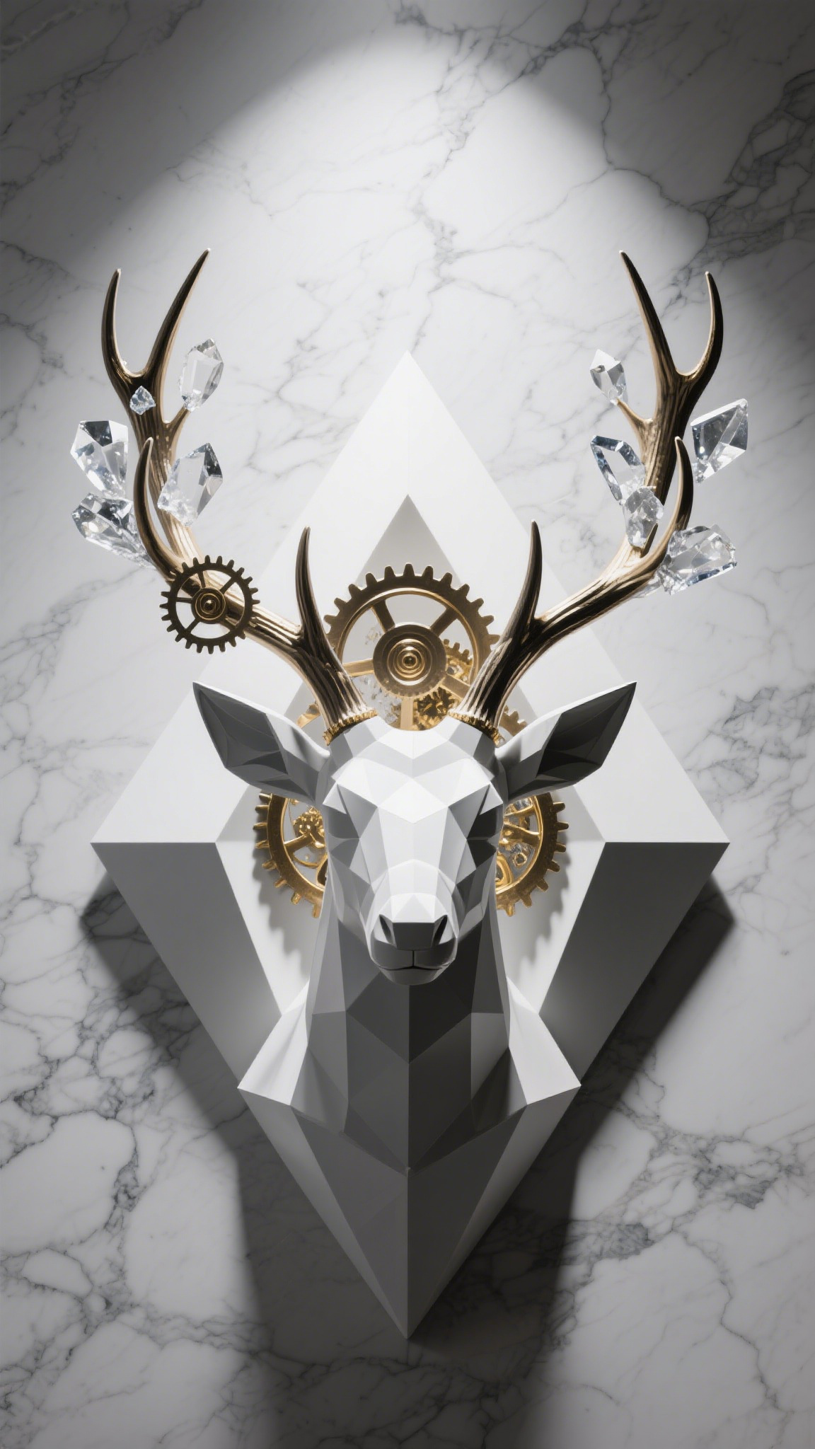 图中抽象几何鹿头镶嵌在大理石墙面,鹿角生长出金属齿轮与水晶。