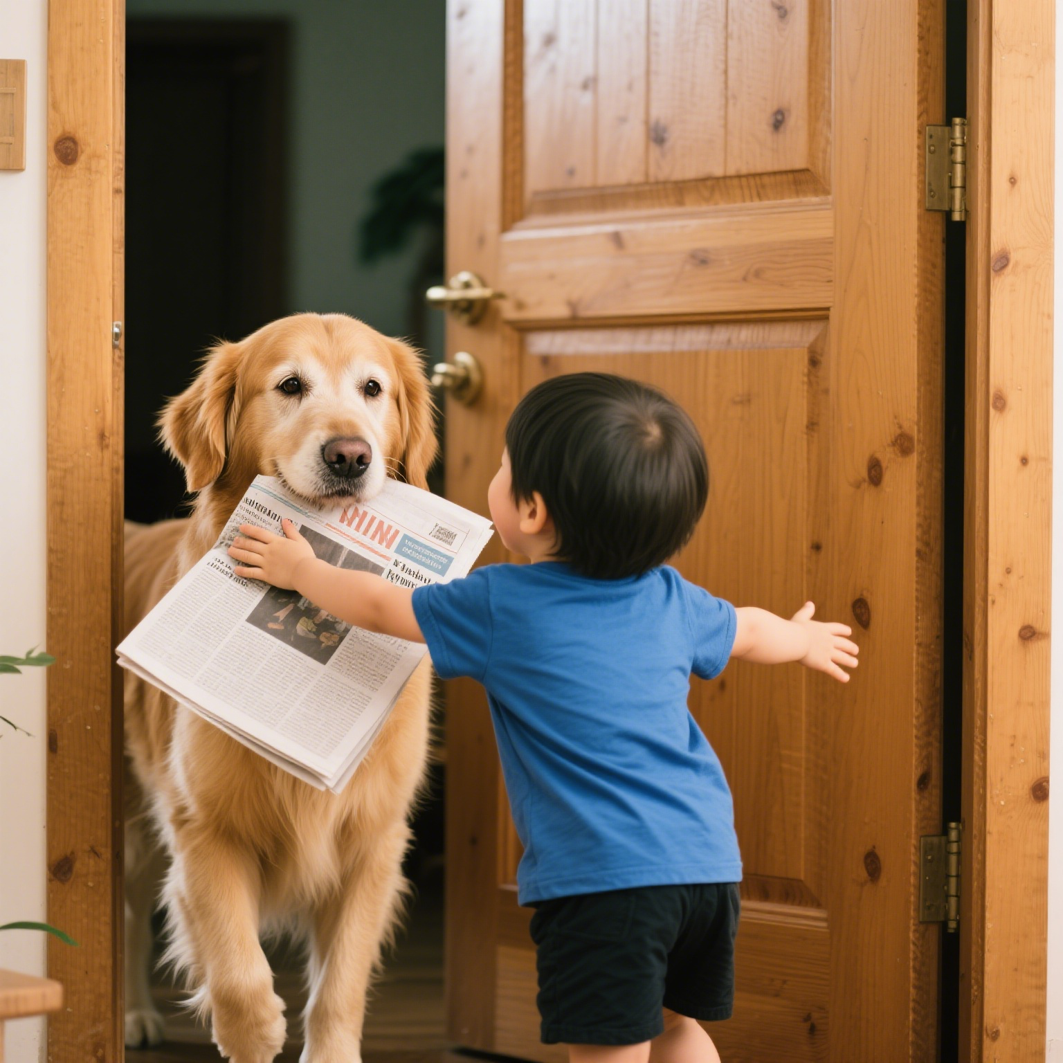 金毛叼着报纸走进家门,迎面扑来小朋友拥抱,背景为木质暖调玄关,动作抓拍自然有爱