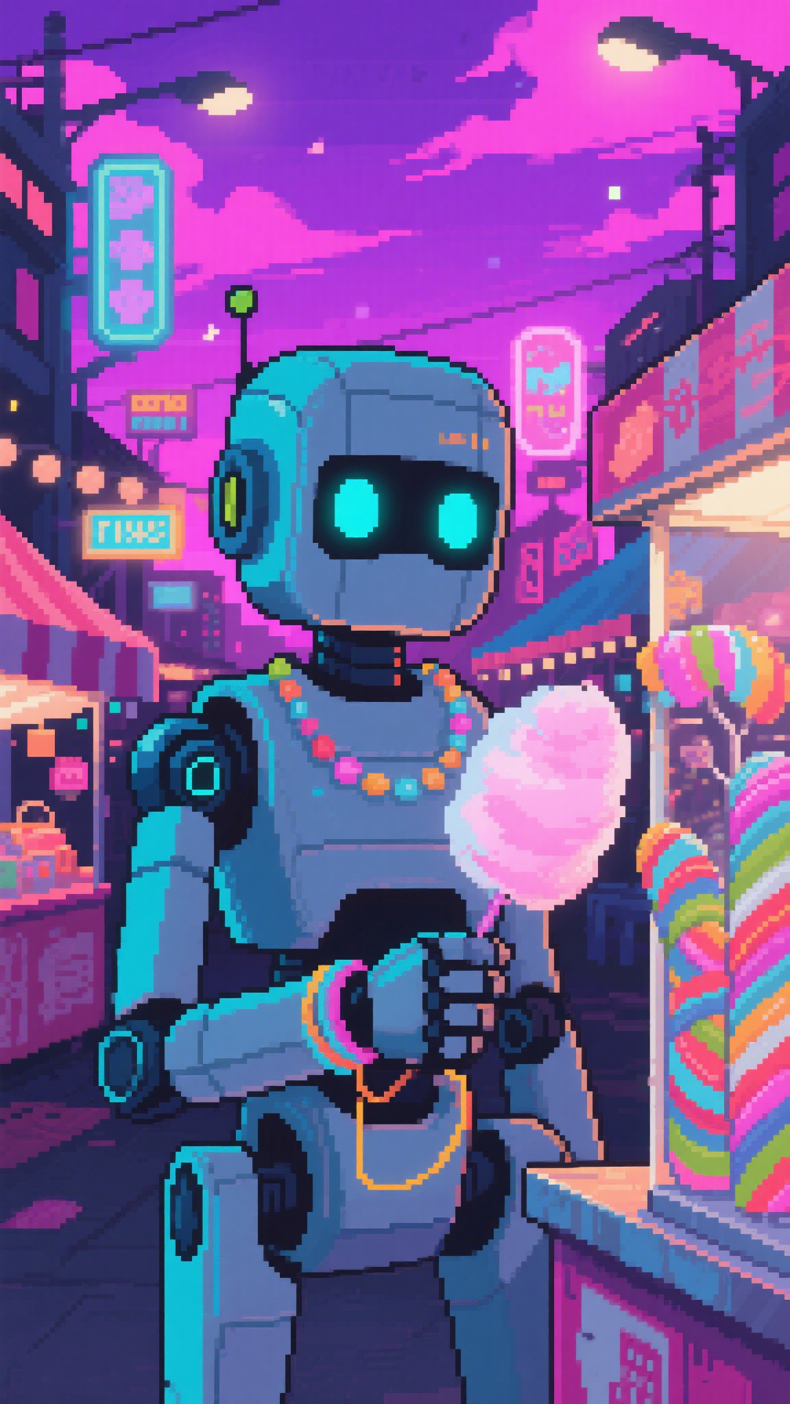 生成一张像素风格的图片,图中像素风的机器人在霓虹夜市贩卖棉花糖。