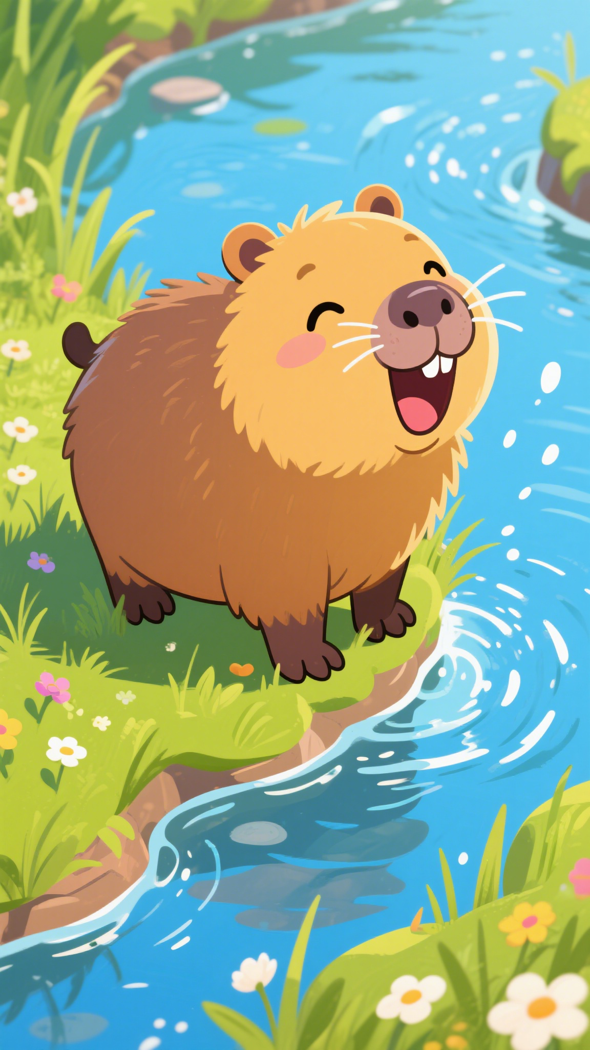 图中一只卡皮巴拉在河边唱歌,风格为卡通风格,比例 「9:16」