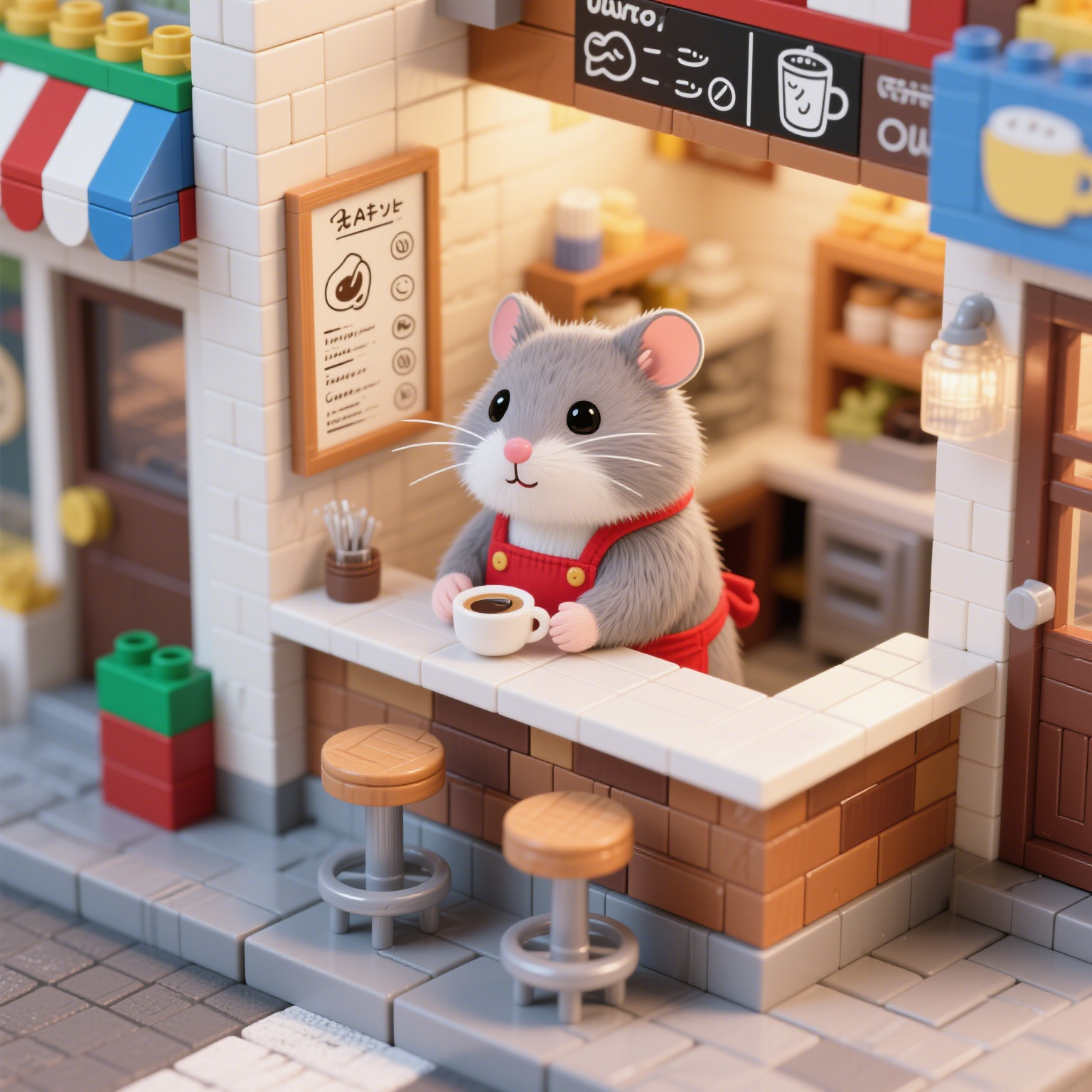 拟人仓鼠坐在迷你咖啡厅的吧台上,背景为拼装积木风格街景,墙上挂有手绘菜单,构图为俯拍居中
