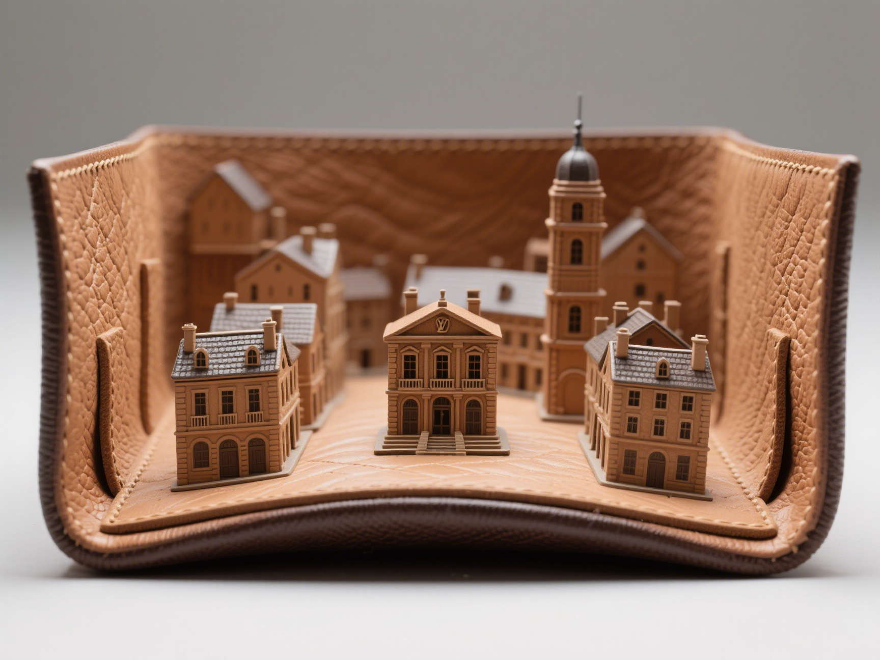 LOUISVUITTON广告画面,极简构图,艺术性,设计感,皮革质感,微缩场景,一个皮革打造的微型城镇。,比例 「4:3」